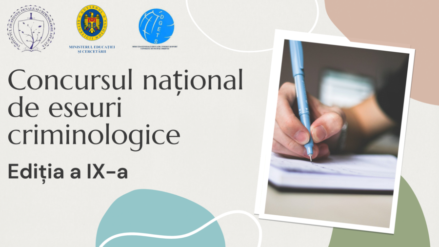 Direcția Generală Educație, Tineret și Sport a Consiliului municipal Chișinău informează că în perioada 01.12.2021 – 25.03.2022, Institutul de Științe Penale și Criminologie Aplicată, sub patronatul Ministerului Educației și Cercetării, va desfășura a IX-a ediție a Concursului Național de Eseuri Criminologice cu genericul “Tineretul pentru o Moldovă fără Criminalitate”.