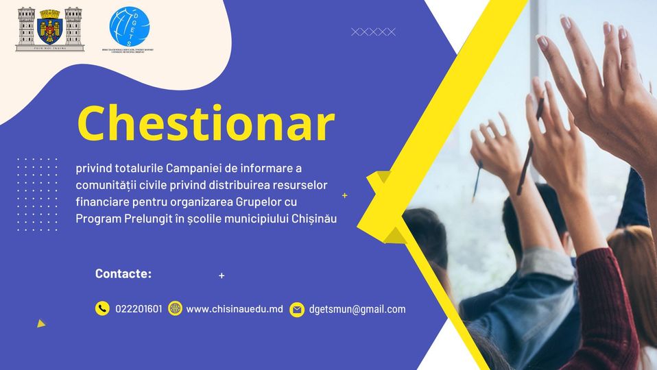 Menționăm că dezinformarea în educație amenință bunăstarea societății, deoarece erodează încrederea socială și agravează inegalitatea. În acest context, Direcția Generală Educație, Tineret și Sport a Primăriei municipiului Chișinău vă îndeamnă să răspundeți la acest chestionar, prin intermediul căruia vom identifica cât de utilă și amplă a fost Campania de informare privind organizarea grupelor cu program prelungit.